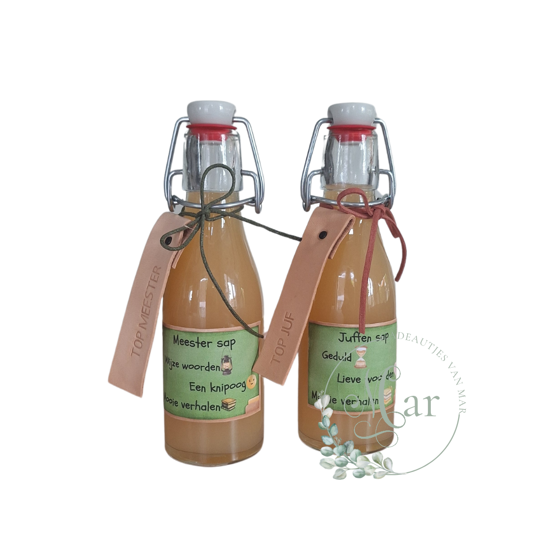 Leuk herbruikbaar flesje met sap en er hangt een leuke leren sleutelhanger aan.