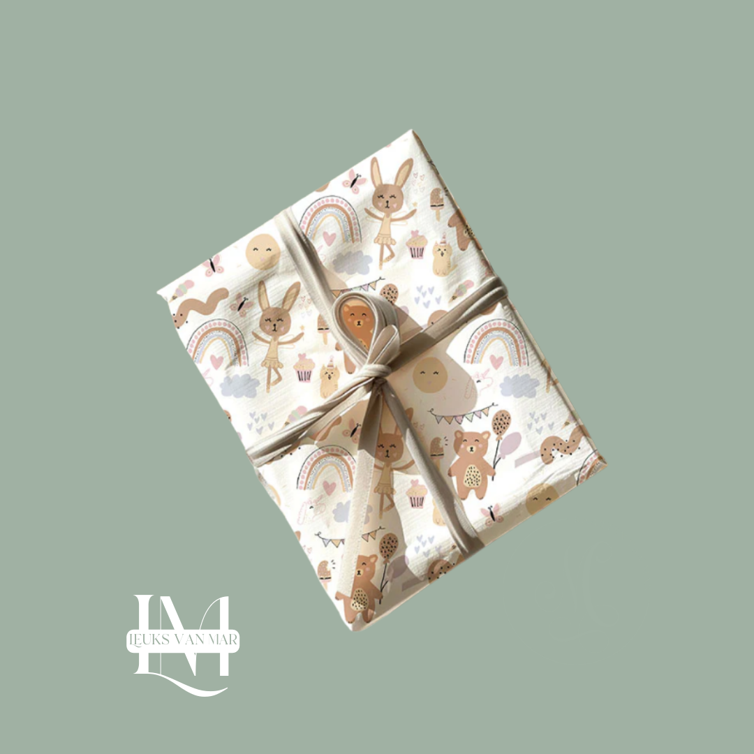 Inpakpapier speciaal voor kinderen in zachte pastel kleuren. Je pakt je cadeautje feestelijk in met dit kadopapier.